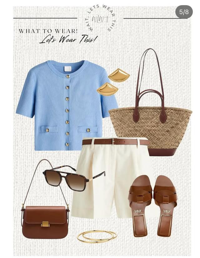 小巧的湖蓝色开衫勾勒温柔弧线,正好适合搭配裤型轮廓很好的西装短裤,奶白色调配好材质,把短裤也能穿出质感,搭配精巧的扇型耳钉,把夏日搭配穿出高级感。