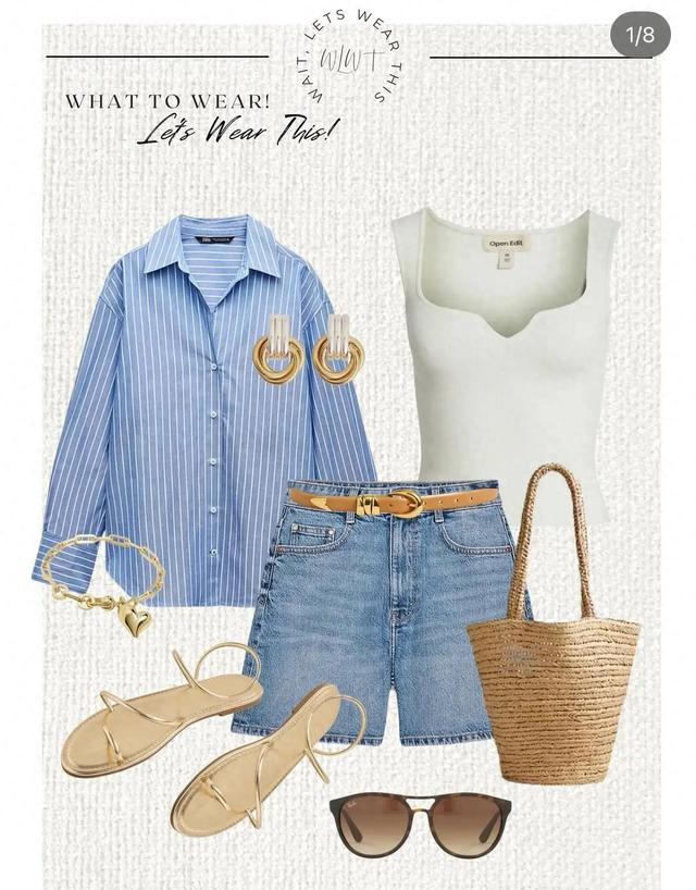 细条纹衬衣,牛仔短裤都是常见款式。但干净蓝色一搭,再配上柔软的藤编包,就是很美好的夏日自然风穿衣。